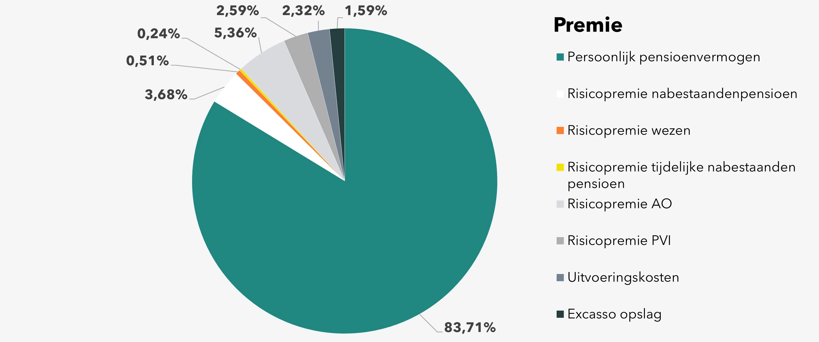 De premie bedraagt een variabel percentage van de pensioengrondslag. In 2025 is dit 35,8 procent. Van deze 35,8 procent gaat er 30,3 procent rechtstreeks naar het persoonlijk pensioenvermogen van de deelnemer. Van de overige 5,5 procent wordt de dekking betaald voor het nabestaandenpensioen en het arbeidsongeschiktheidspensioen. Daarnaast worden daarmee de uitvoeringskosten betaald.