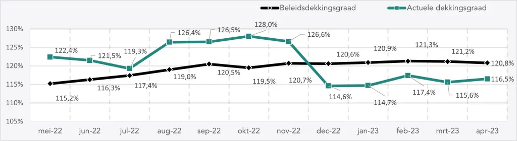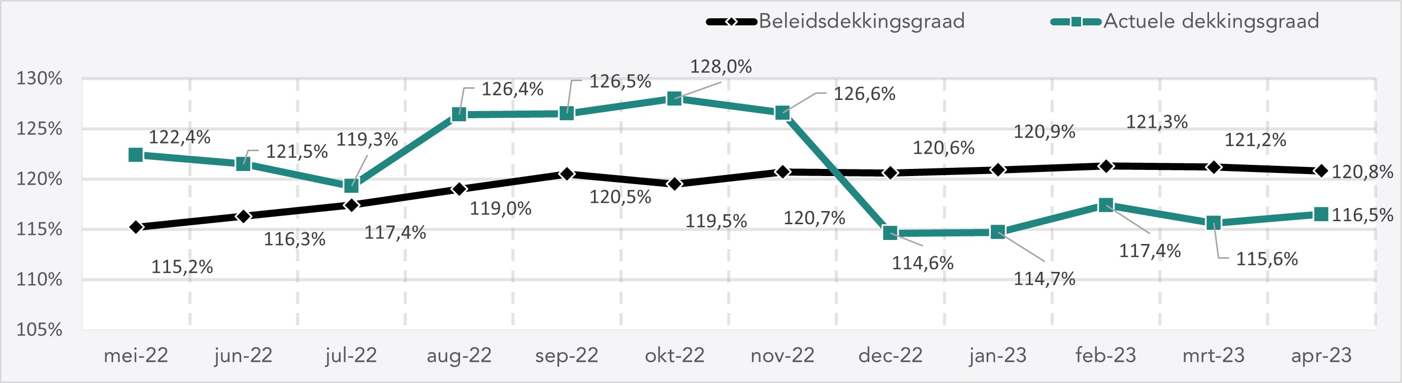 De geschatte actuele dekkingsgraad eind april 2023 bedraagt 116,5% (was eind maart 2023 115,6%). De geschatte beleidsdekkingsgraad eind april 2023 bedraagt 120,8% (was eind maart 2023 121,25%).
