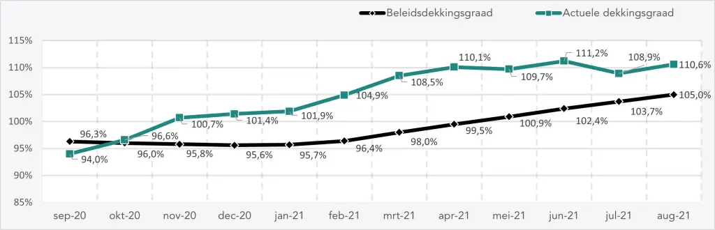 De geschatte actuele dekkingsgraad eind augustus 2021 bedraagt 110,6% (was eind juli 2021 108,9%). De geschatte beleidsdekkingsgraad eind augustus 2021 bedraagt 105,0% (was eind juli 2021 103,7%).