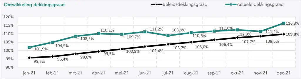 De geschatte actuele dekkingsgraad eind december 2021 bedraagt 116,3% (was eind november 2021 111,4%). De geschatte beleidsdekkingsgraad eind december 2021 bedraagt 109,8% (was eind november 2021 108,6%).