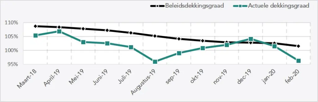 De geschatte actuele dekkingsgraad eind februari 2020 bedraagt 96,3% (was eind januari 2020 101,5%). De geschatte beleidsdekkingsgraad eind februari 2020 bedraagt 101,5% (was eind januari 2019 102,5%).