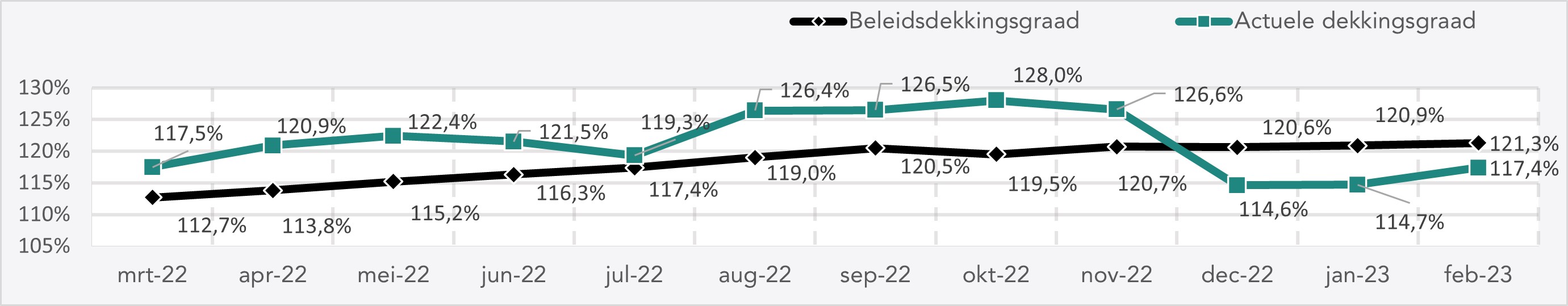 De geschatte actuele dekkingsgraad eind februari 2023 bedraagt 117,4% (was eind januari 2023 114,7%). De geschatte beleidsdekkingsgraad eind februari 2023 bedraagt 121,3% (was eind januari 2023 120,9%).