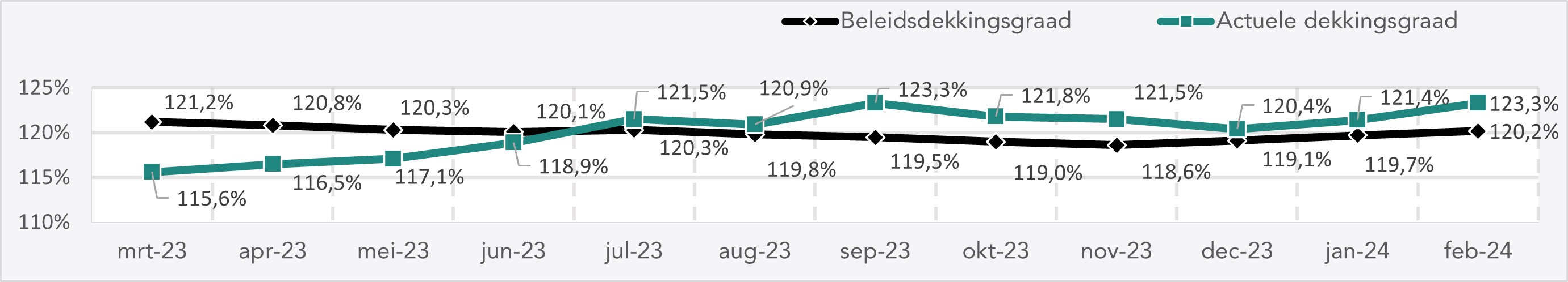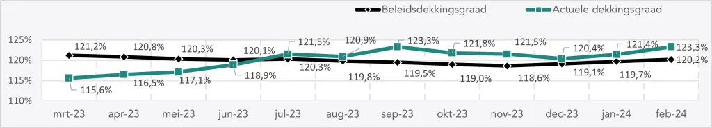 De geschatte actuele dekkingsgraad eind februari 2024 bedraagt 123,3% (was eind januari 2024 121,4%). De geschatte beleidsdekkingsgraad eind februari 2024 bedraagt 120,2% (was eind januari 2024 119,7%).
