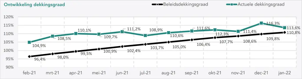 De geschatte actuele dekkingsgraad eind januari 2022 bedraagt 113,6% (was eind december 2021 116,3%). De geschatte beleidsdekkingsgraad eind januari 2022 bedraagt 110,8% (was eind december 2021 109,8%).