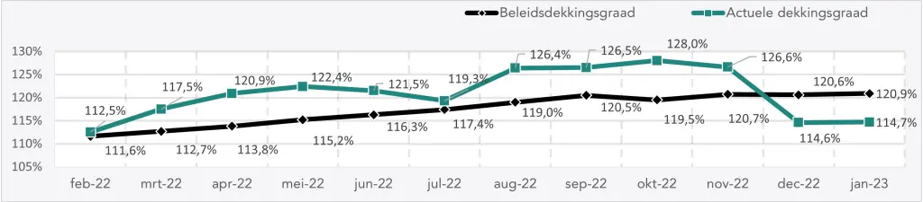 De geschatte actuele dekkingsgraad eind januari 2023 bedraagt 114,7% (was eind december 2022 114,6%). De geschatte beleidsdekkingsgraad eind januari 2023 bedraagt 120,9% (was eind december 2022 120,6%).
