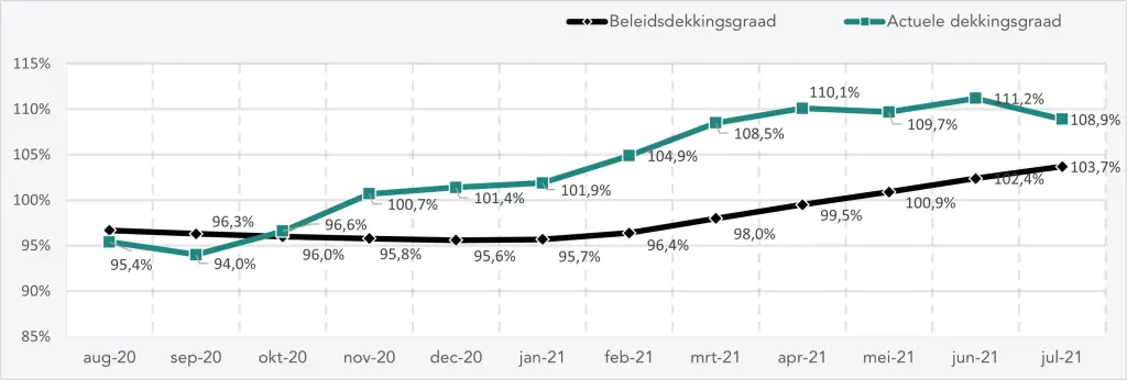 De geschatte actuele dekkingsgraad eind juli 2021 bedraagt 108,9% (was eind juni 2021 111,2%). De geschatte beleidsdekkingsgraad eind juli 2021 bedraagt 103,7% (was eind juni 2021 102,4%).