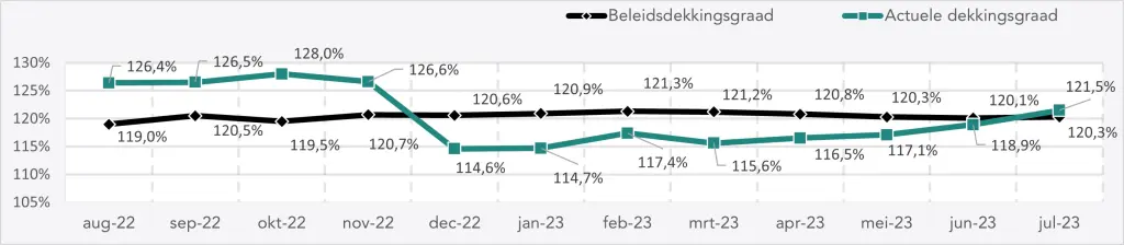 De geschatte actuele dekkingsgraad eind juli 2023 bedraagt 121,5% (was eind juni 2023 118,9%). De geschatte beleidsdekkingsgraad eind juli 2023 bedraagt 120,3% (was eind juni 2023 120,1%).