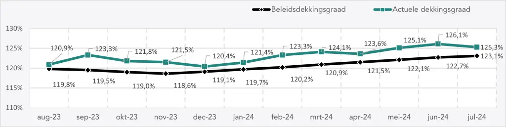 De geschatte actuele dekkingsgraad eind juli 2024 bedraagt 125,3% (was eind juni 2024 126,1%). De geschatte beleidsdekkingsgraad eind juli 2024 bedraagt 123,1% (was eind juni 2024 122,7%).