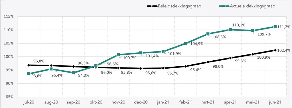 De geschatte actuele dekkingsgraad eind juni 2021 bedraagt 111,2% (was eind mei 2021 109,7%). De geschatte beleidsdekkingsgraad eind juni 2021 bedraagt 102,4% (was eind mei 2021 100,9%).