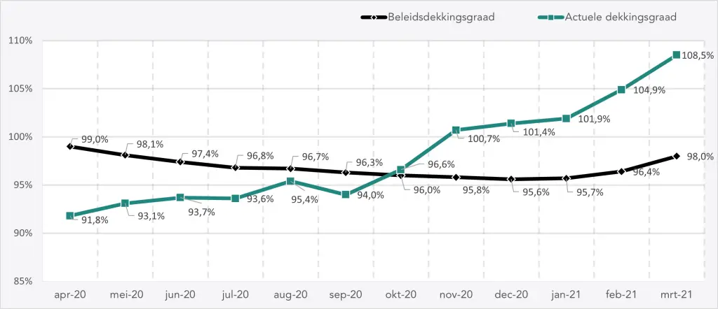 De geschatte actuele dekkingsgraad eind maart 2021 bedraagt 108,5% (was eind februari 2021 104,9%). De geschatte beleidsdekkingsgraad eind maart 2021 bedraagt 98,0% (was eind februari 2021 96,4%).