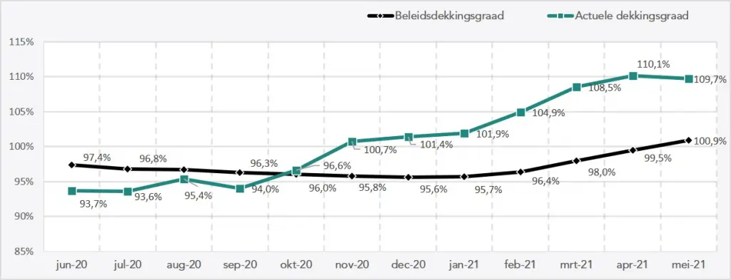 De geschatte actuele dekkingsgraad eind mei 2021 bedraagt 109,7% (was eind april 2021 110,1%). De geschatte beleidsdekkingsgraad eind mei 2021 bedraagt 100,9% (was eind april 2021 99,5%).