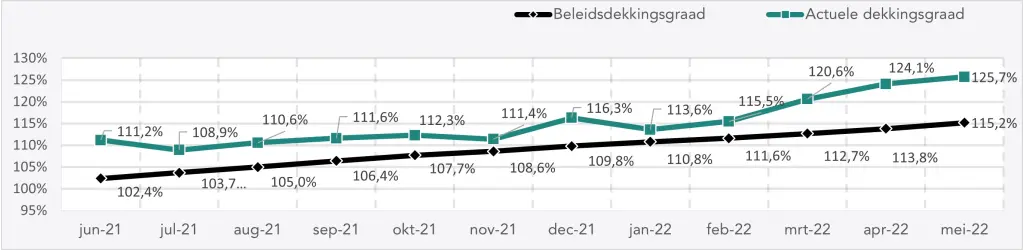 De geschatte actuele dekkingsgraad eind mei 2022 bedraagt 125,7% (was eind april 2022 124,1%). De geschatte beleidsdekkingsgraad eind mei 2022 bedraagt 115,2% (was eind april 2022 113,8%).