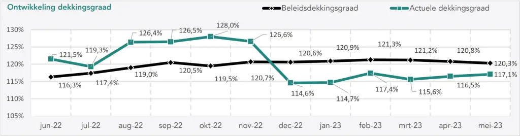 De geschatte actuele dekkingsgraad eind mei 2023 bedraagt 117,1% (was eind april 2023 116,5%). De geschatte beleidsdekkingsgraad eind mei 2023 bedraagt 120,3% (was eind april 2023 120,8%).