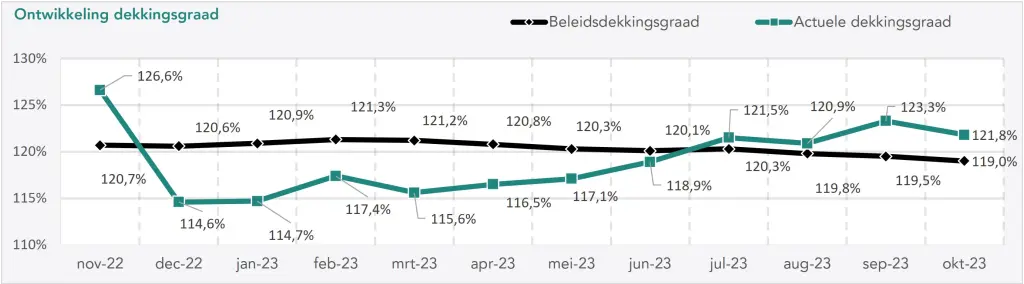 De geschatte actuele dekkingsgraad eind oktober 2023 bedraagt 121,8% (was eind september 2023 123,3%). De geschatte beleidsdekkingsgraad eind oktober 2023 bedraagt 119,0% (was eind september 2023 119,5%).