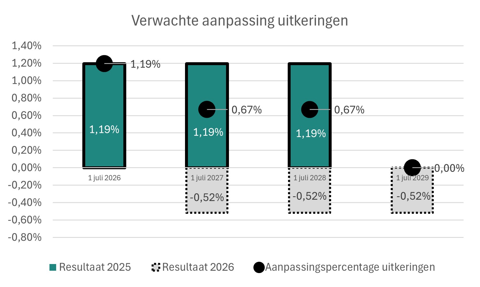 In het diagram geeft het zwarte bolletje de verwachte aanpassing van de uitkering per 1 juli van een jaar aan. De groene kolommen met een doorgetrokken lijn zijn zeker, omdat het betreffende jaar is afgesloten. Het zwarte bolletje voor 2026 staat vrijwel vast, hier lopen momenteel de jaarwerkcontroles voor. De grijze kolommen met een stippellijn zijn nog onzeker, omdat het betreffende jaar nog niet is afgesloten. Daardoor zijn de zwarte bolletjes voor 2027, 2028 en 2029 nog afhankelijk van toekomstige resultaten en kunnen ze nog veranderen.