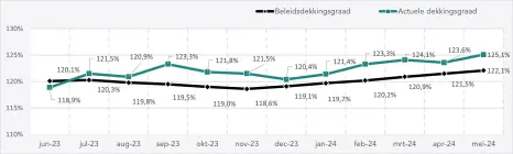 De geschatte actuele dekkingsgraad eind mei 2024 bedraagt 125,1% (was eind april 2024 123,6%). De geschatte beleidsdekkingsgraad eind mei 2024...