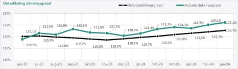 De geschatte actuele dekkingsgraad eind juni 2024 bedraagt 126,1% (was eind mei 2024 125,1%). De geschatte beleidsdekkingsgraad eind juni 2024...