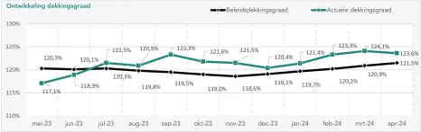 De geschatte actuele dekkingsgraad eind april 2024 bedraagt 123,6% (was eind maart 2024 124,1%). De geschatte beleidsdekkingsgraad eind april 2024...