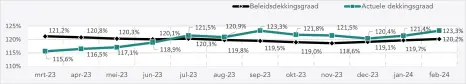 De geschatte actuele dekkingsgraad eind februari 2024 bedraagt 123,3% (was eind januari 2024 121,4%). De geschatte beleidsdekkingsgraad eind februari...