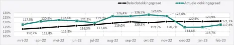 De geschatte actuele dekkingsgraad eind februari 2023 bedraagt 117,4% (was eind januari 2023 114,7%). De geschatte beleidsdekkingsgraad eind februari...