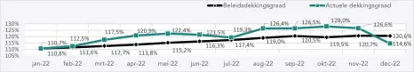 De geschatte actuele dekkingsgraad eind december 2022 bedraagt 114,6% (was eind november 2022 126,6%). De geschatte beleidsdekkingsgraad eind...