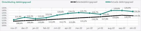 De geschatte actuele dekkingsgraad eind oktober 2022 bedraagt 128,0% (was eind september 2022 129,9%). De geschatte beleidsdekkingsgraad eind oktober...