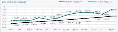 De geschatte actuele dekkingsgraad eind augustus 2022 bedraagt 129,8% (was eind juli 2022 122,4%). De geschatte beleidsdekkingsgraad eind augustus...