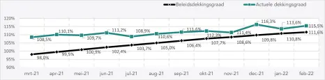 De geschatte actuele dekkingsgraad eind februari 2022 bedraagt 115,5% (was eind januari 2022 113,6%). De geschatte beleidsdekkingsgraad eind februari...