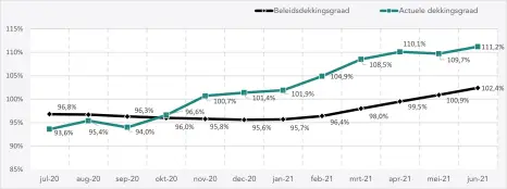 De geschatte actuele dekkingsgraad eind juni 2021 bedraagt 111,2% (was eind mei 2021 109,7%). De geschatte beleidsdekkingsgraad eind juni 2021...