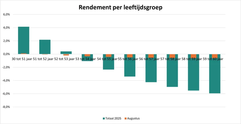Met het rendement tot en met augustus zouden de lopende pensioenuitkeringen vanaf 2026 met 1,123% kunnen stijgen. Deze stijging (of een eventuele daling) smeren we altijd uit over drie jaar. Dat betekent met het huidige rendement dat de verhoging in 2026, en in de twee jaren daarna, circa 0,37% per jaar bedraagt. Maar let op: er volgen nog een aantal maanden. Uiteindelijk tellen de resultaten over heel 2025.