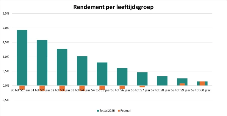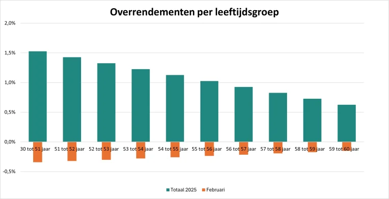 Met het rendement tot en met februari zouden de lopende pensioenuitkeringen vanaf 2026 met 0,640% kunnen stijgen. Deze stijging (of een eventuele daling) smeren we altijd uit over drie jaar. Dat betekent met het huidige rendement dat de verhoging in 2026, en in de twee jaren daarna, circa 0,21% per jaar bedraagt. Maar let op: het jaar is nog maar net begonnen. Uiteindelijk tellen de resultaten over heel 2025.